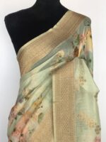 Sea Green Linen Silk Saree with Beautiful Prints along with Antique Zari Border