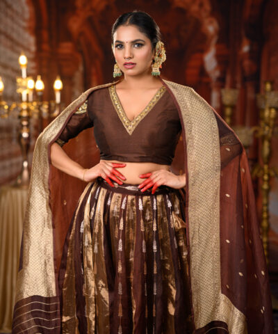 Brown Embroidered Tissue Silk Lehenga Set of 3