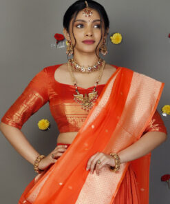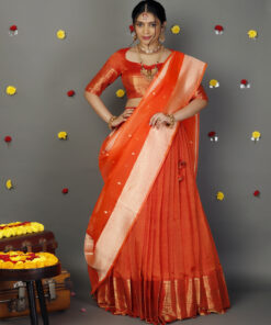 Orangish Red Banarasi Silk Half Saree ( Set of 3)