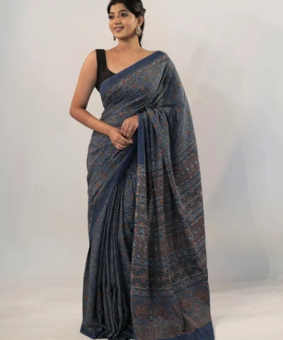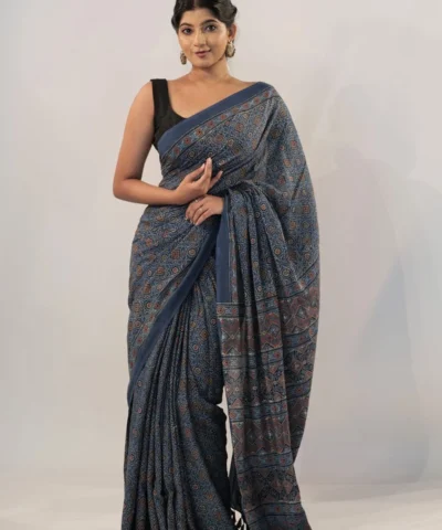 Blue Printed Ajrakh Cotton Saree