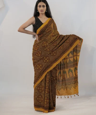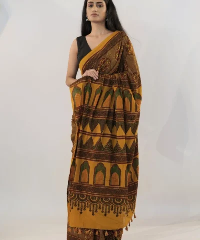 Mustard Ajrakh Block Printed Cotton Saree