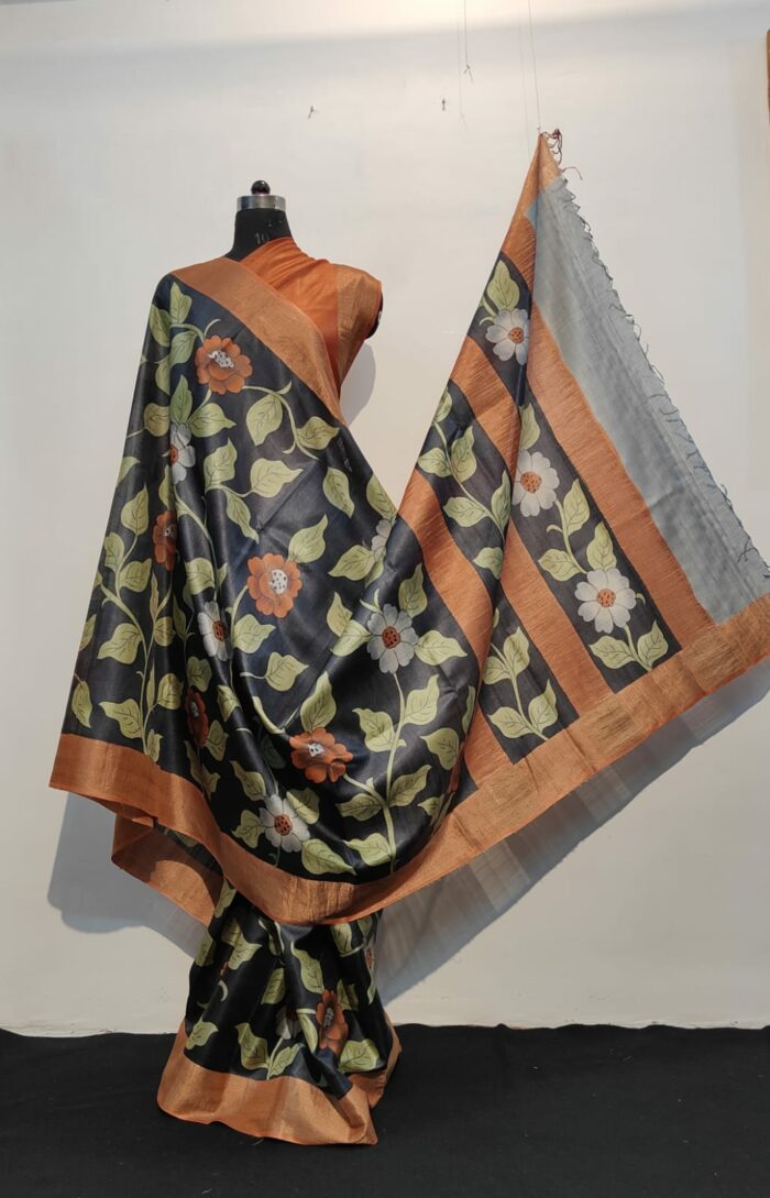 Black Tussar Silk Saree with Embroidered Silk Blouse