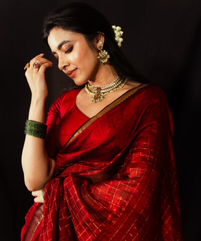 Maroon Mangalagiri Silk Saree in Gold Zari Chequered Pattern