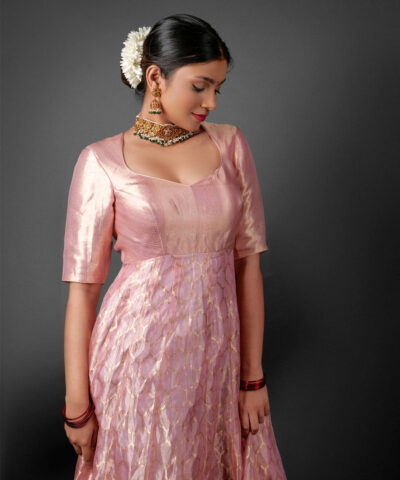 Onion Pink Banarasi Silk Anarkali highlighted with Gold Zari Weaves
