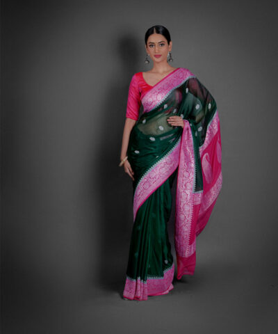Bottle Green Chiffon Silk Saree with Kadwa Zari Buttis