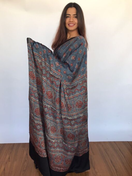 Pure Blue Ajrakh Modal Silk Saree with Hand Block Prints