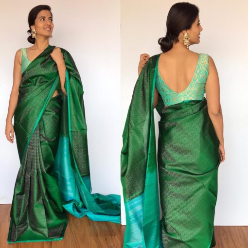 - Bottle Green Kanchivaram Silk Saree with Silver Zari Brocade Weaves