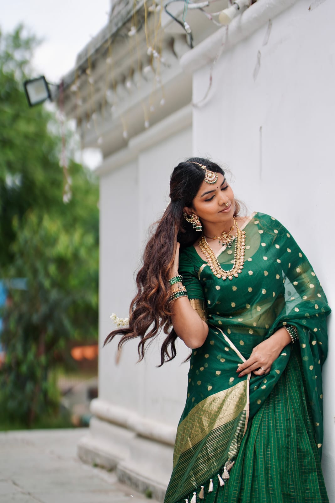 Bottle Green Silk Chequered Lehenga Set of 3