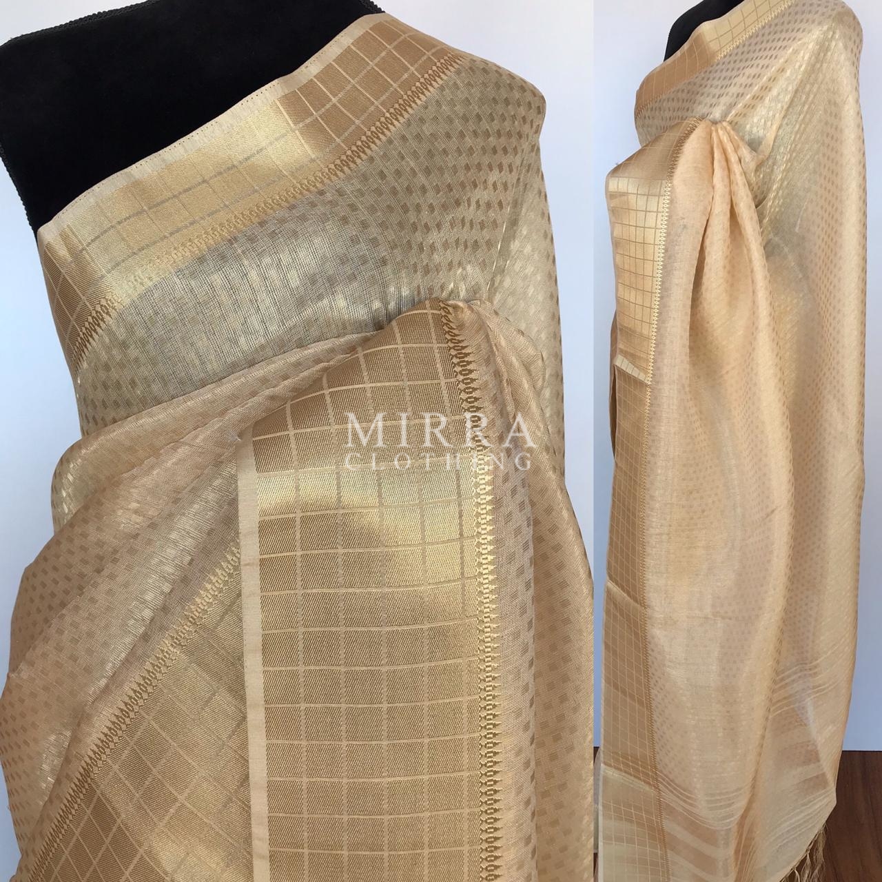 • Cream Banarasi Silk Saree with Gold Zari Weaves