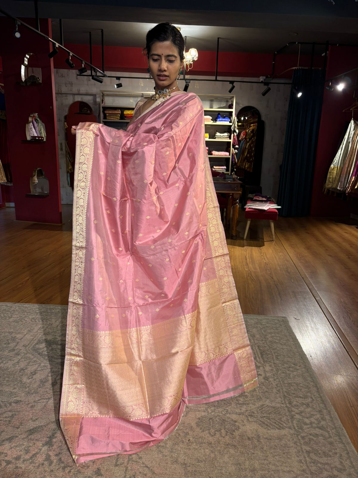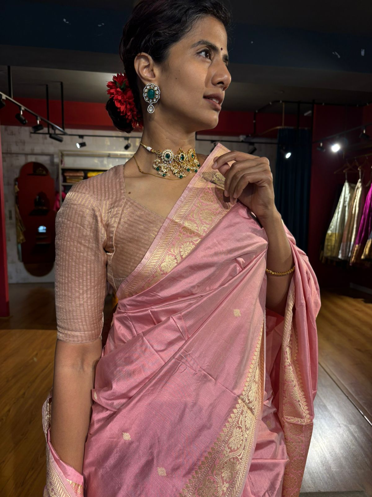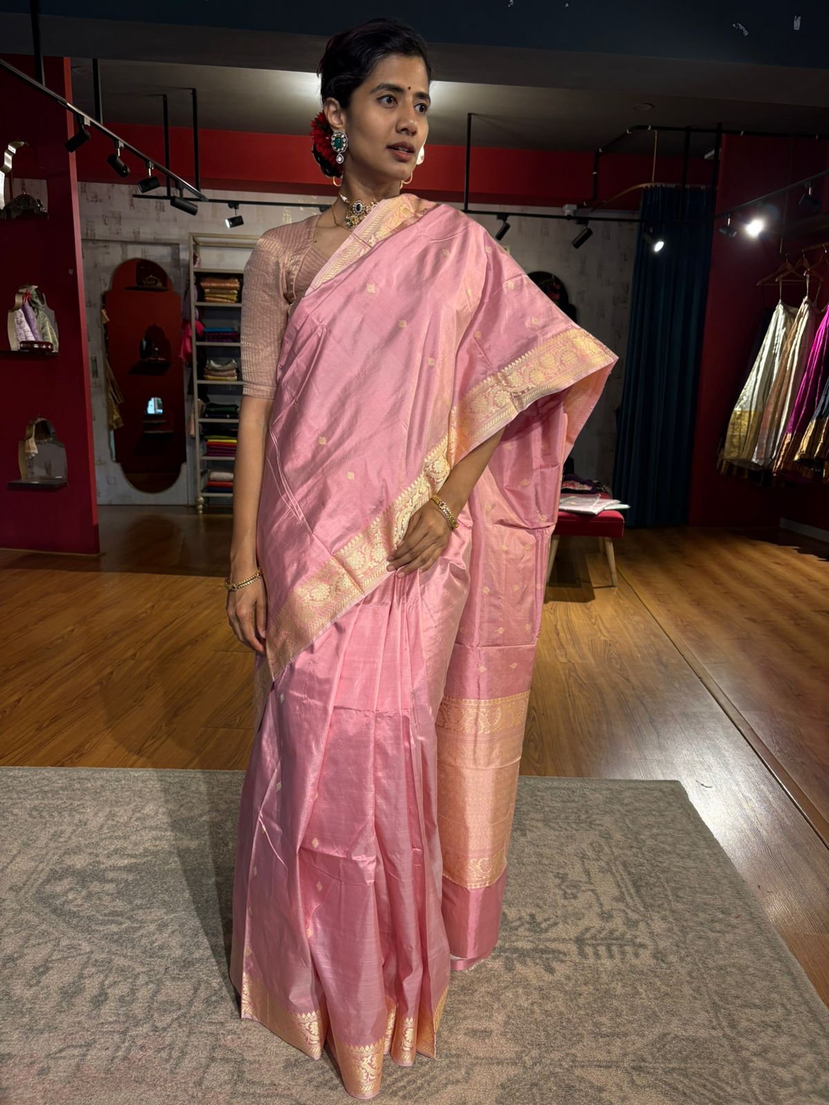 Creamy Pastel Pink Handwoven Banarasi Katan Silk Saree with Kadhwa Motifs