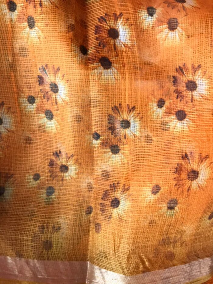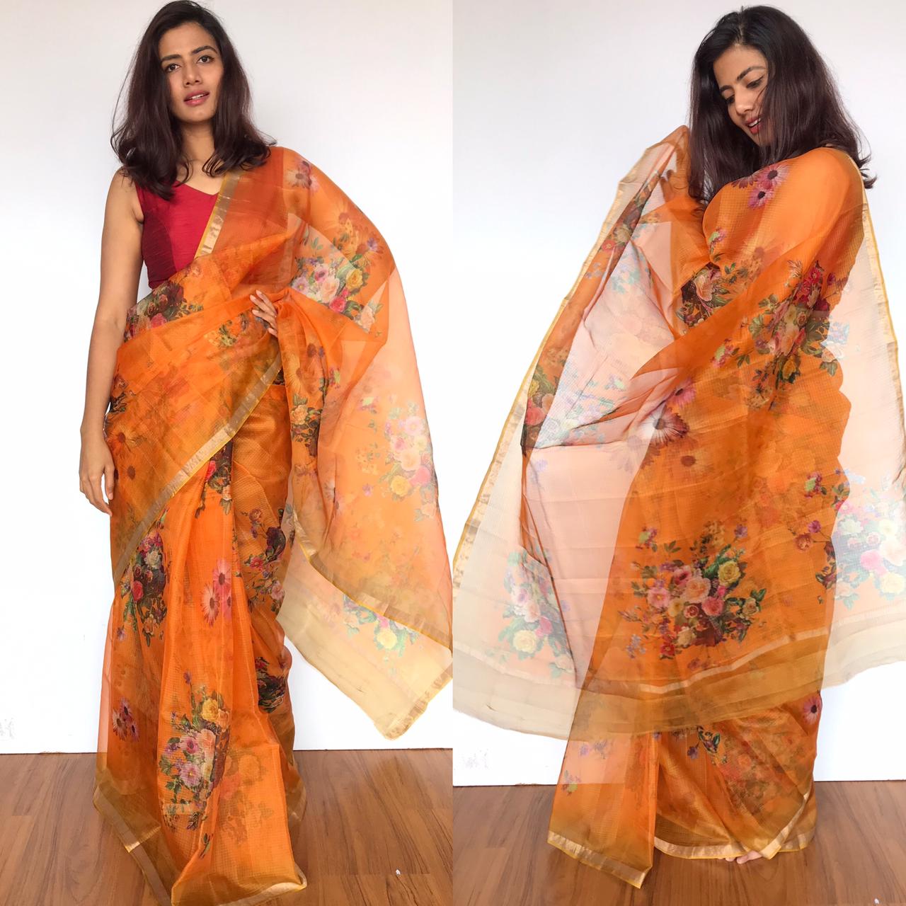 Dark Orange Kota Silk Saree with Beautiful Floral Prints