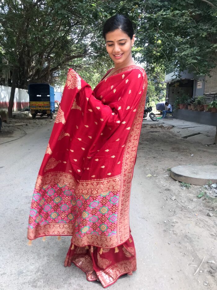 Be the first to review “Deep Red Dola Silk Saree with Gota Patti Work”