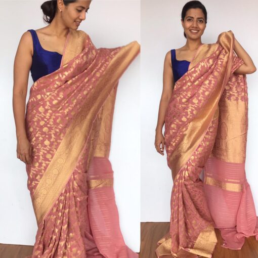 Dusty Pink Banarasi Silk Saree in Georgette adorned with Gold Zari Weaves