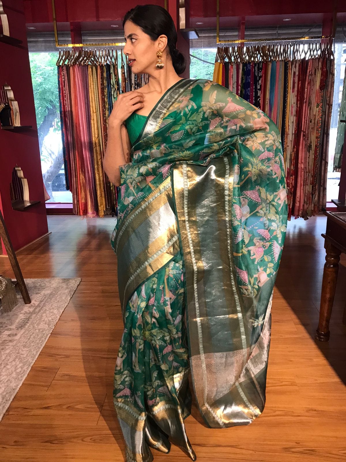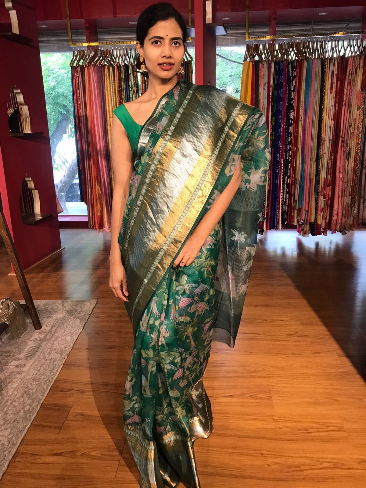 Be the first to review “Green Organza Silk Saree with Kanchi Zari Border”