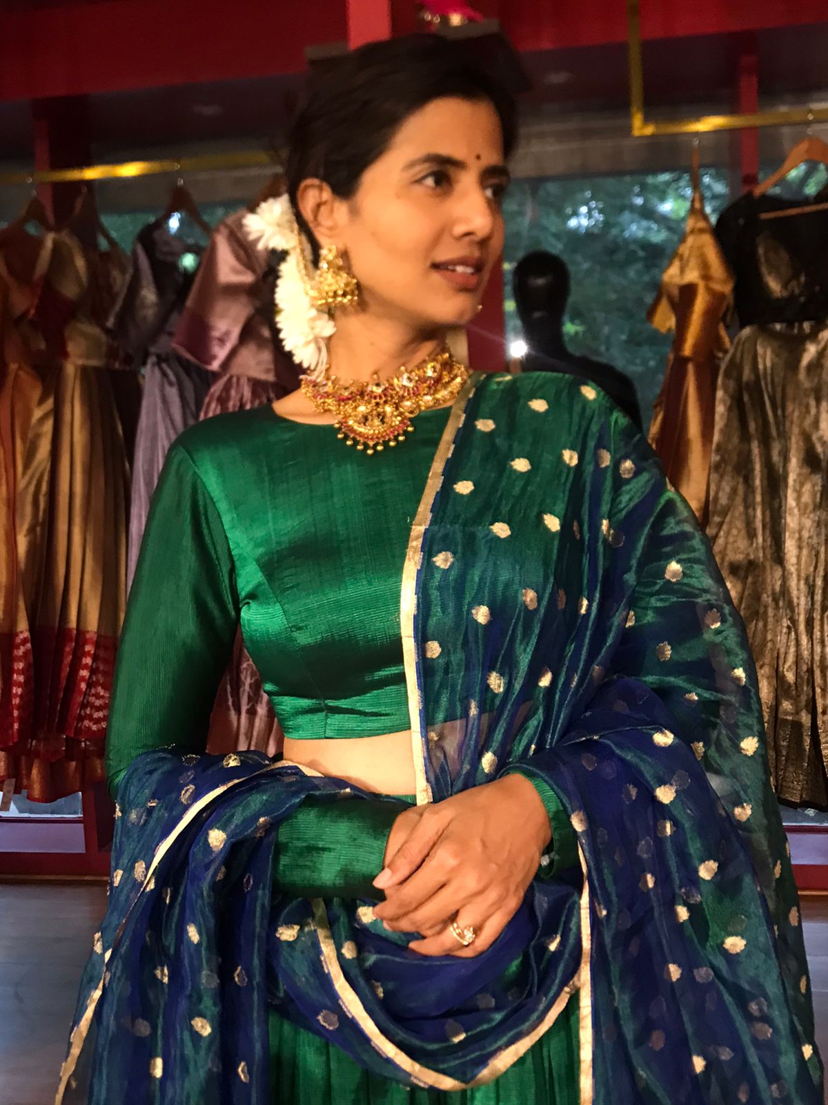 Be the first to review “Green Silk Half Saree Set with Tissue Silk Dupatta (Set of 3)”