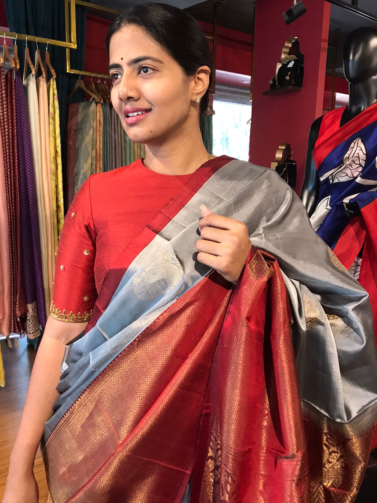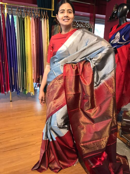 Grey Kanjivaram Silk Saree with Handwoven Gold zari weaves