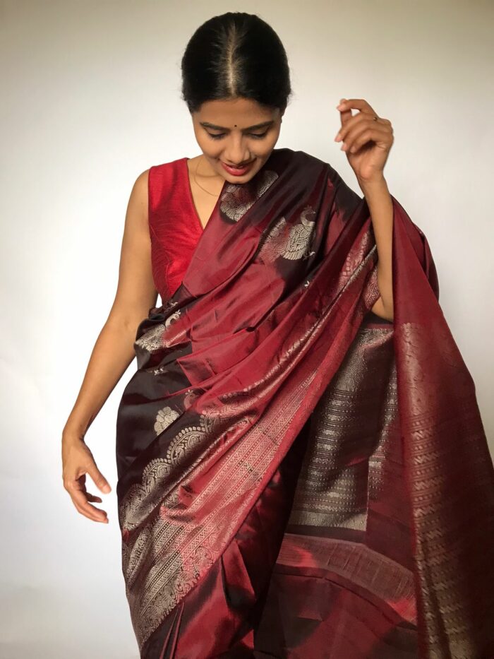 Be the first to review “Maroon Kanjivaram Silk Saree with Silver Zari Weaves”