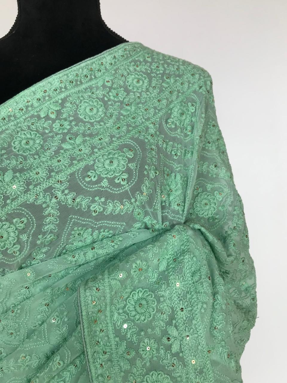 Mint Green Georgette Saree with Lucknowi Thread Work