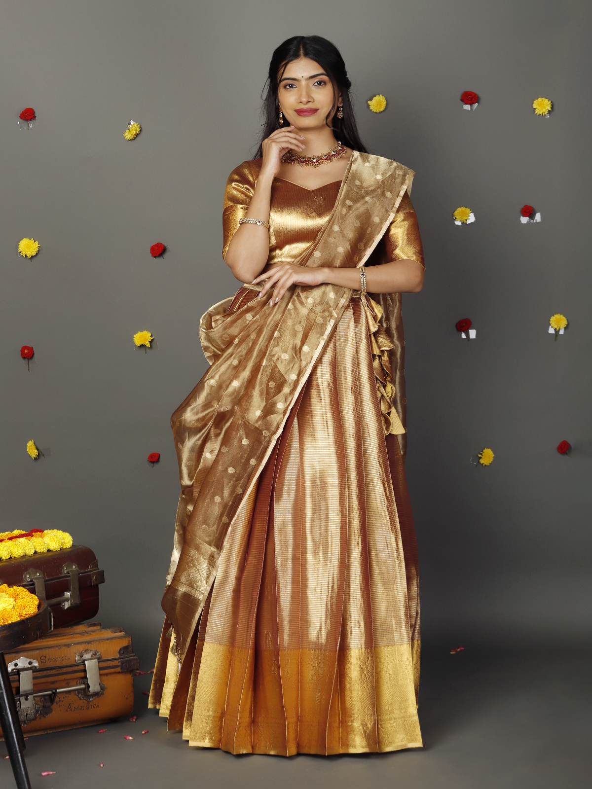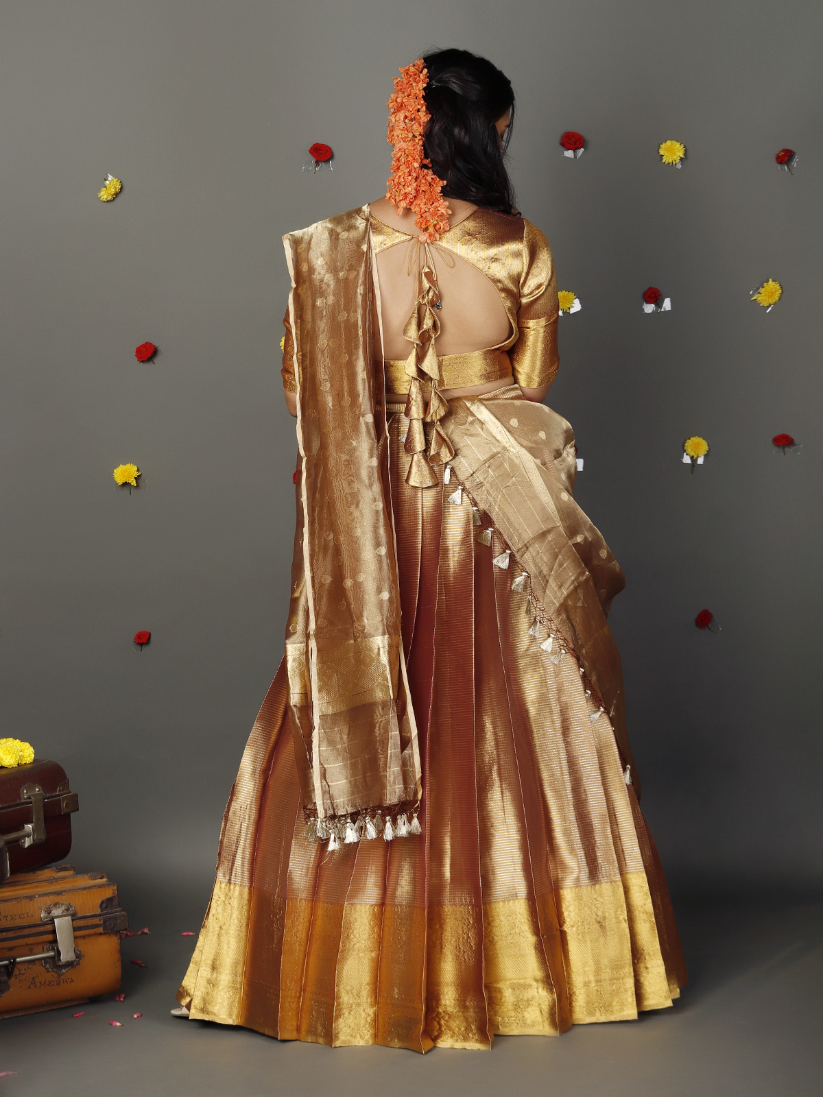 Be the first to review “Molten Gold Tissue Silk Lehenga Set of 3”