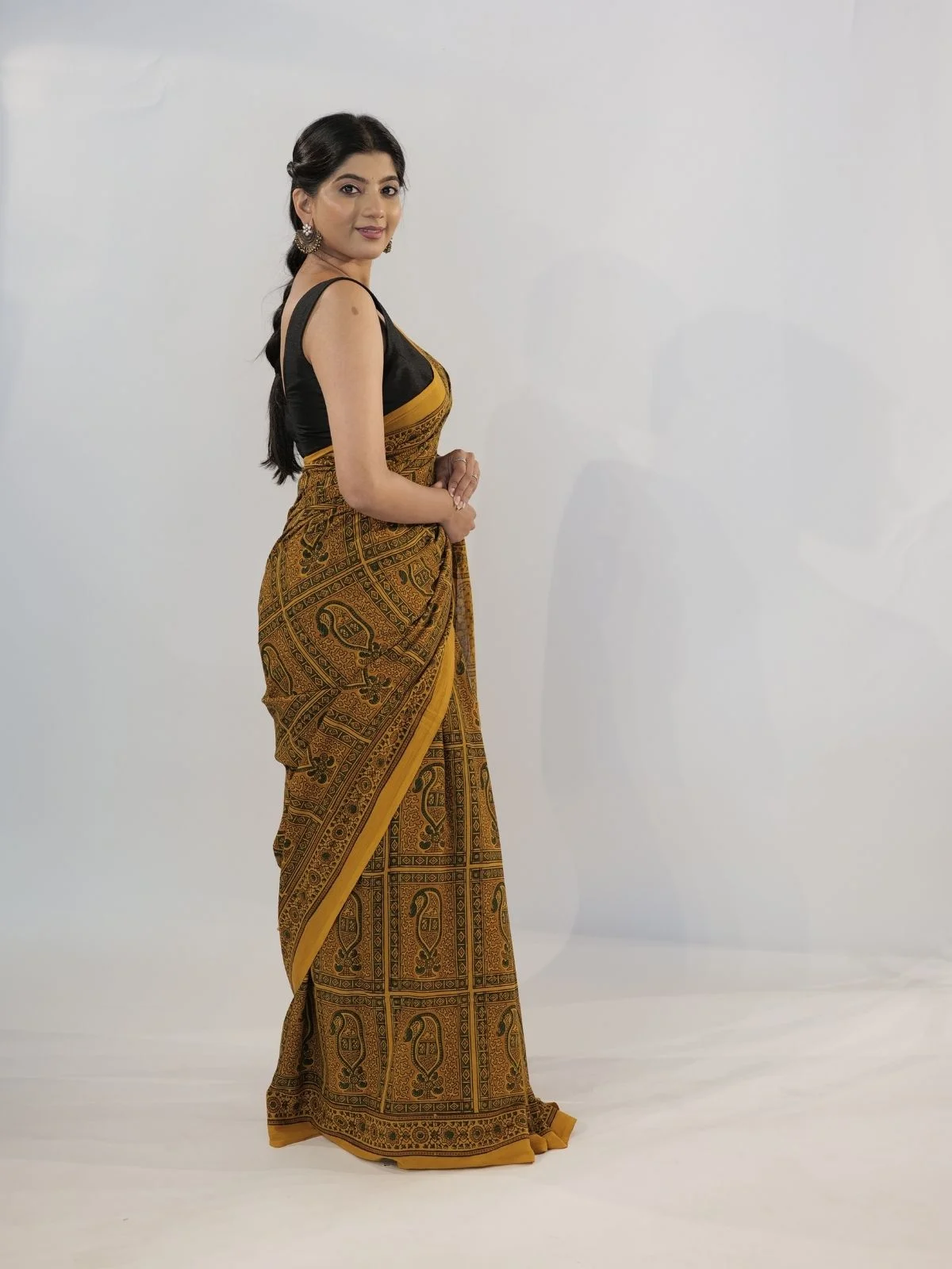 Be the first to review “Mustard Ajrakh Block Printed Cotton Saree”