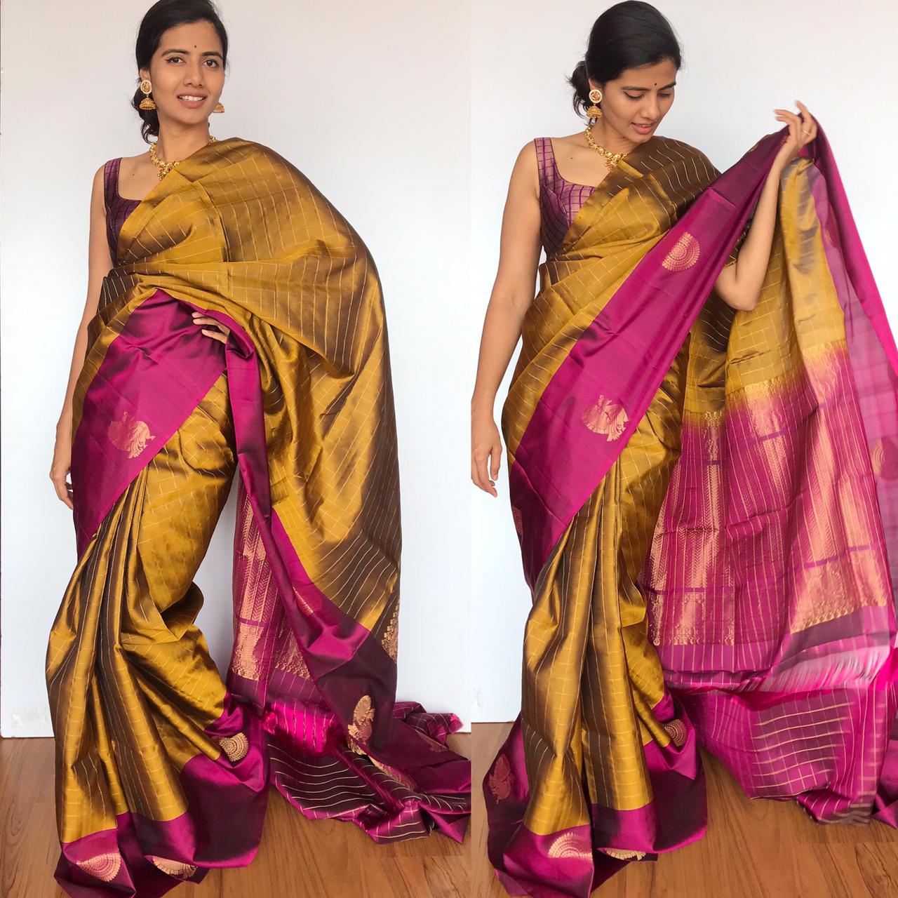 Mustard Kanjivaram Silk Saree with Handwoven Gold Zari Checks