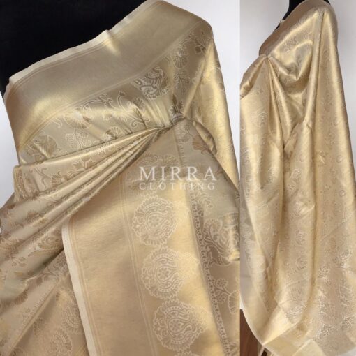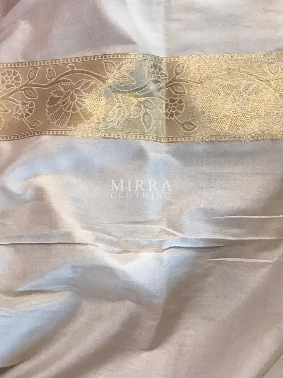 • Off white Banarasi Silk Saree with Gold Zari Weaves all over along with Zari Woven Pallu
