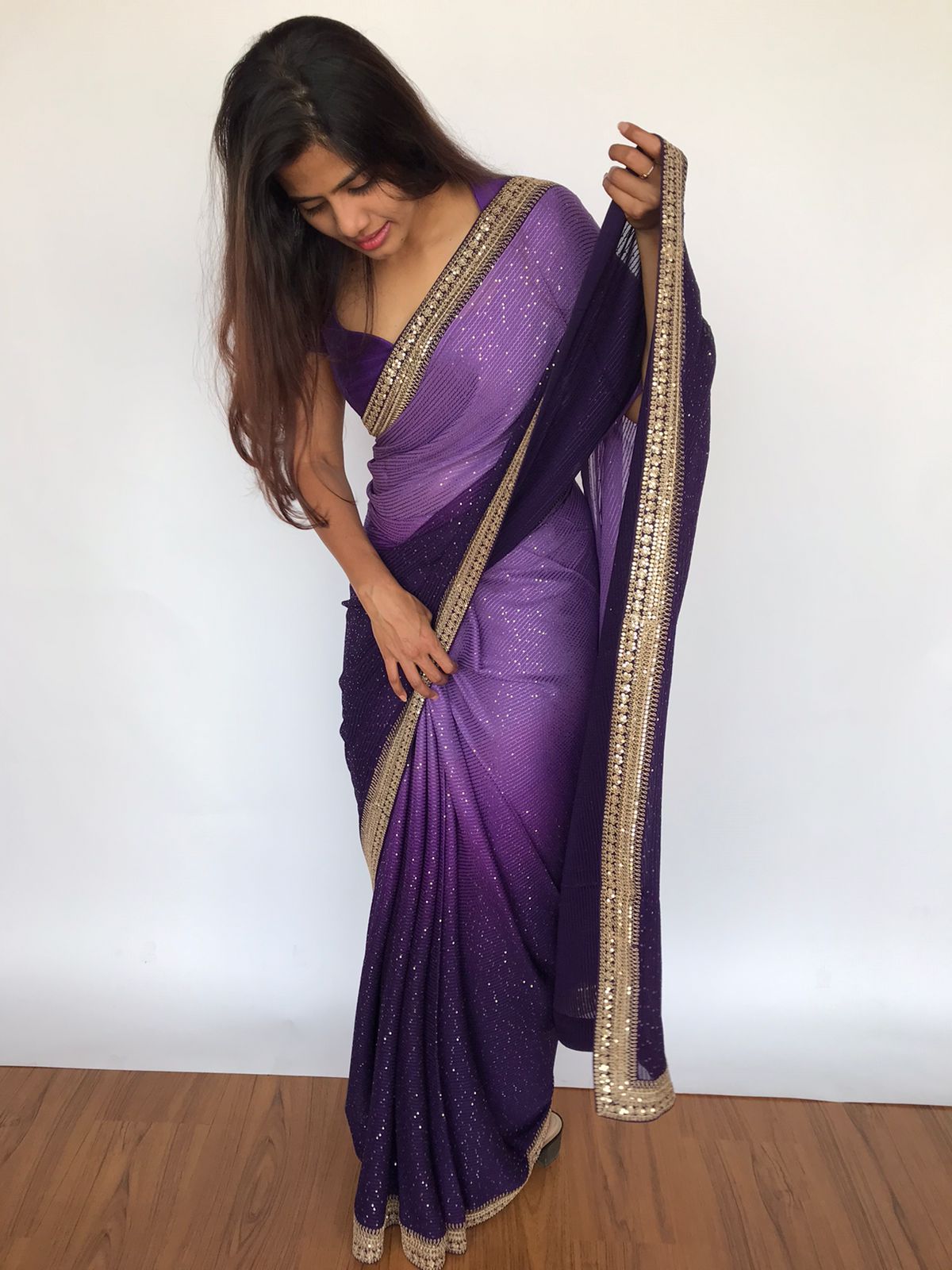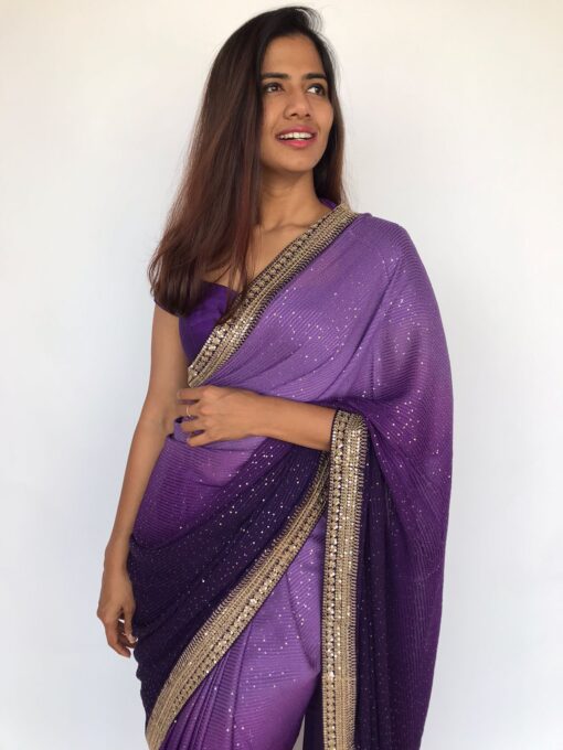 Ombre Purple Georgette Sequin Saree with Hand Embroidered Border
