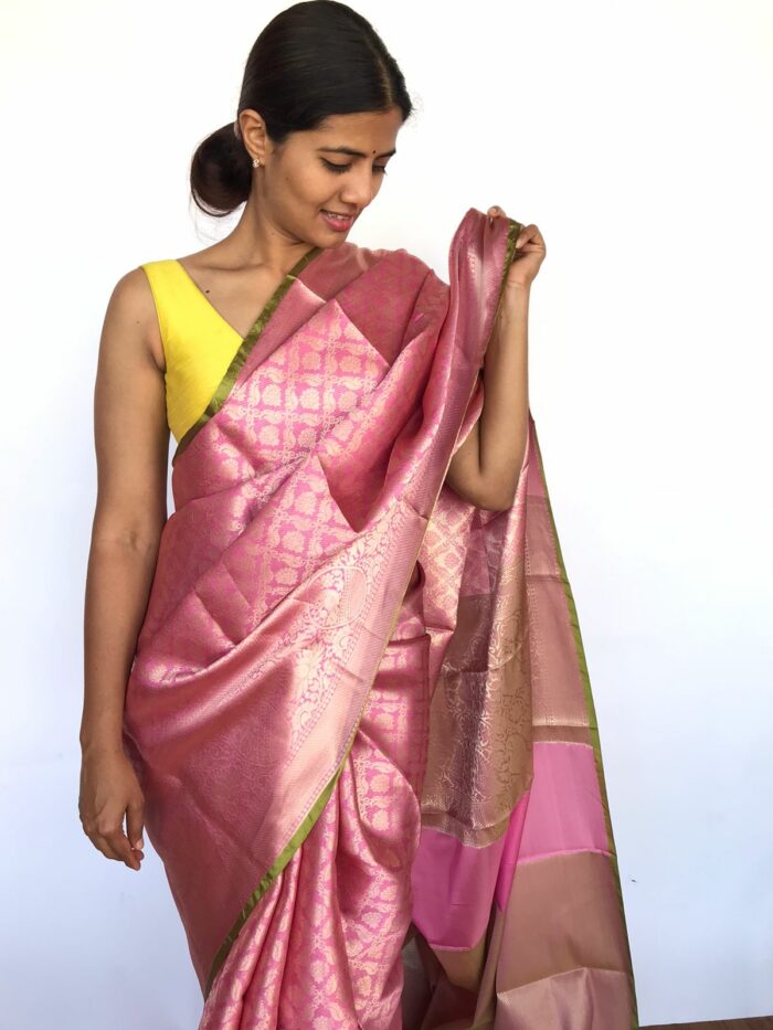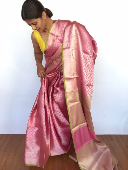• Onion Pink Kora Silk Saree highlighted with Silver Zari Weaves