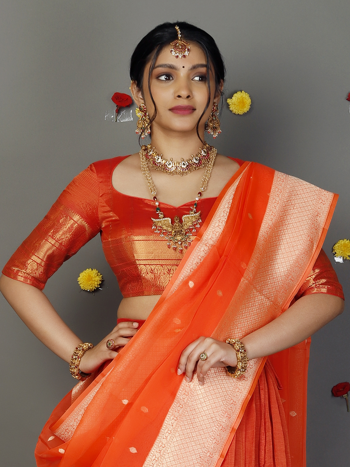 Add a hint of opulence to your ethnic look with this Organza Dupatta, adorned with gold zari buttis for a rich, traditional finish. The sheer fabric brings lightness while the zari adds sparkle, making it a versatile accessory for any lehenga or suit. Ideal for festive styling, wedding layering, or evening functions. A graceful add-on to elevate any outfit effortlessly.