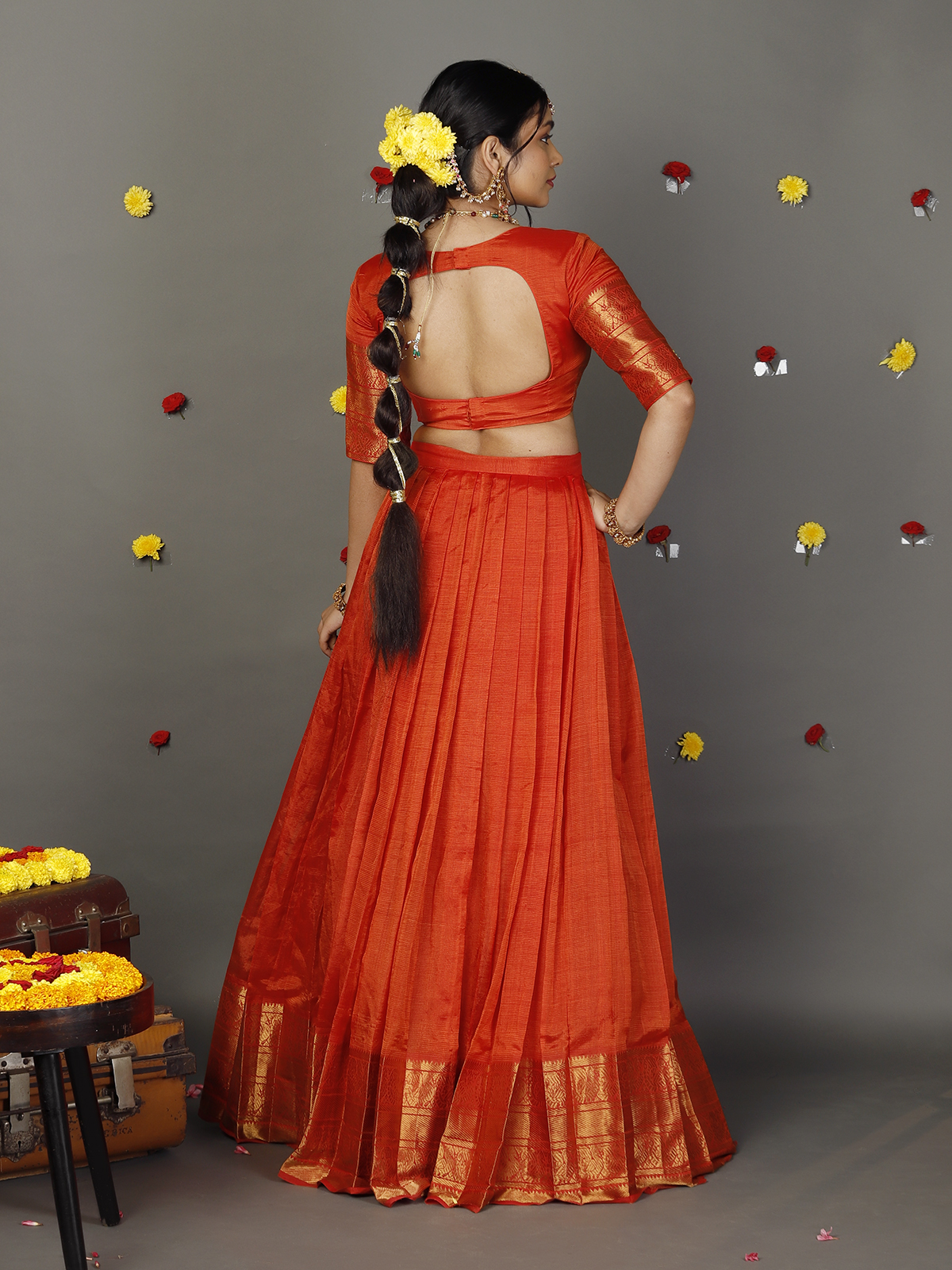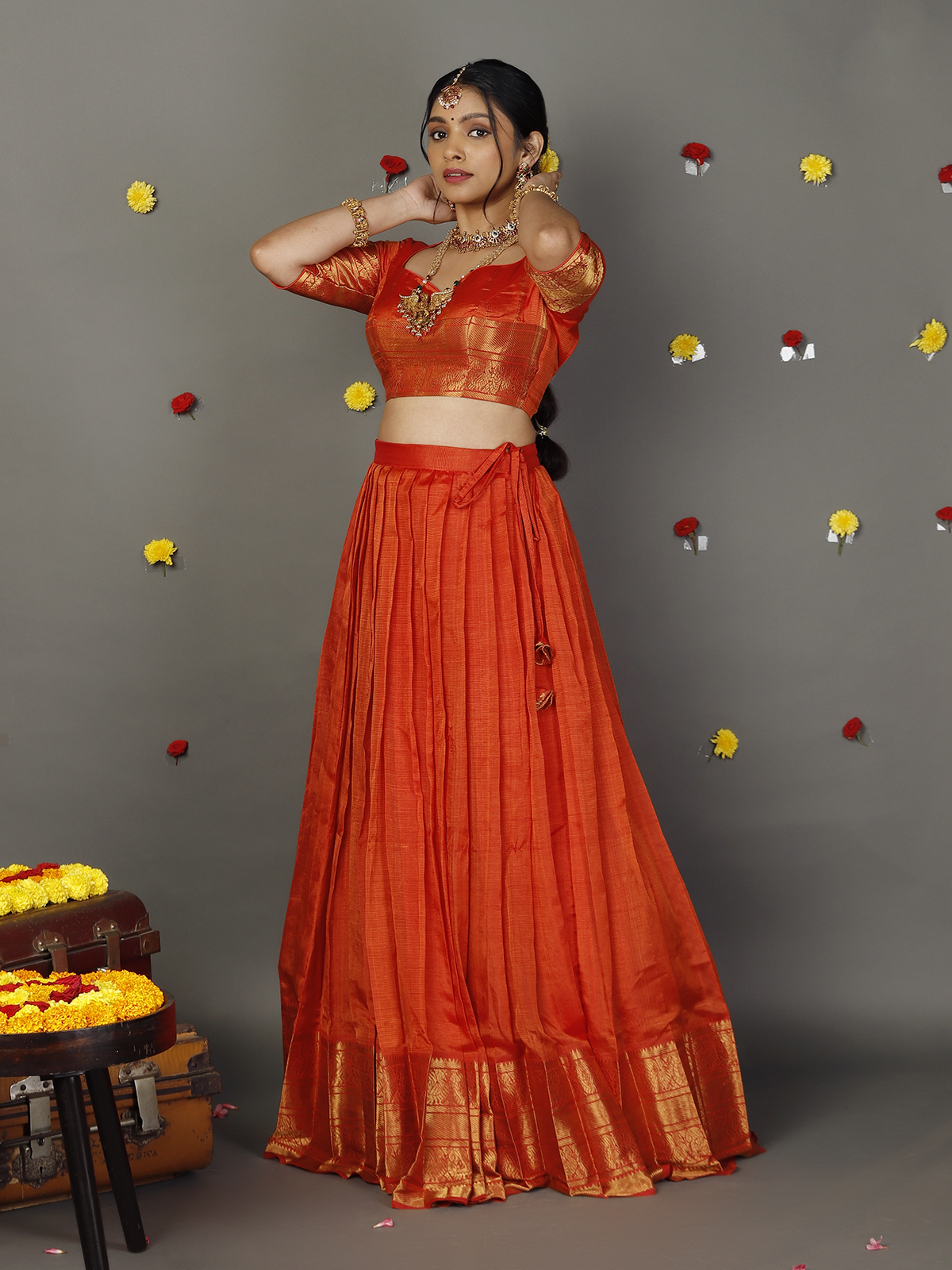 • Radiate festive energy with this Orange Silk Lehenga Set of 2, crafted in lustrous silk that glows with every movement. The bright hue and classic cut make it an ideal choice for haldi ceremonies, Diwali gatherings, and family celebrations. With its minimalistic elegance, it allows room for heavy accessorizing or a statement dupatta. An effortless pick for the modern traditionalist.