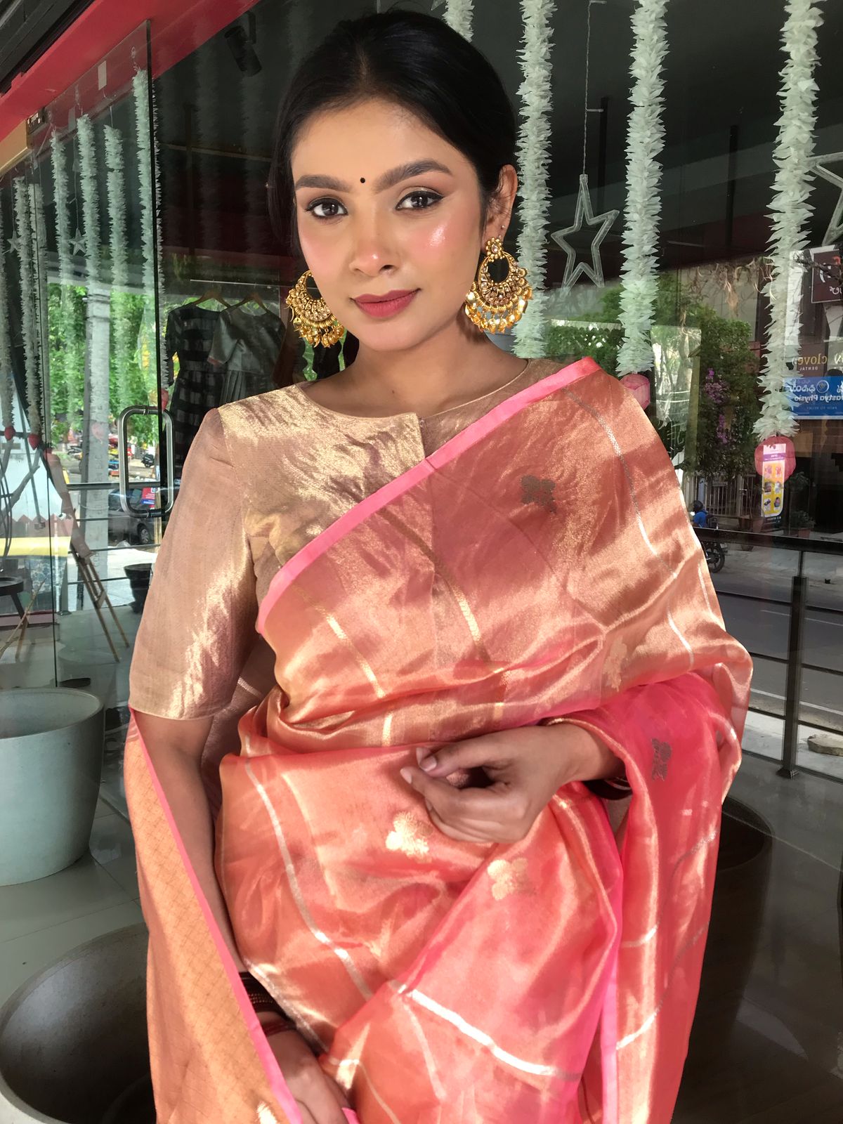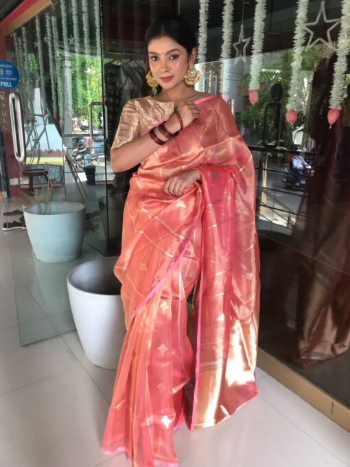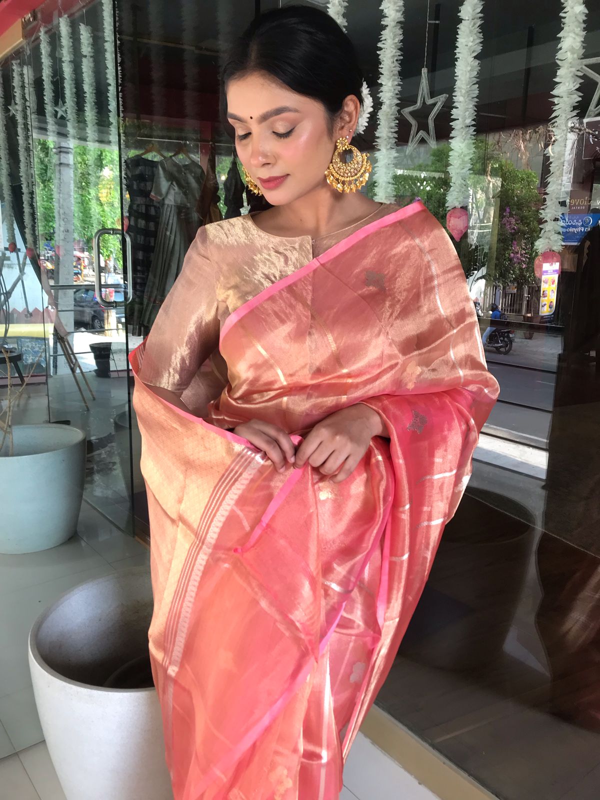 Peach Handwoven Tissue Silk Saree with Kadhwa Zari Motifs
