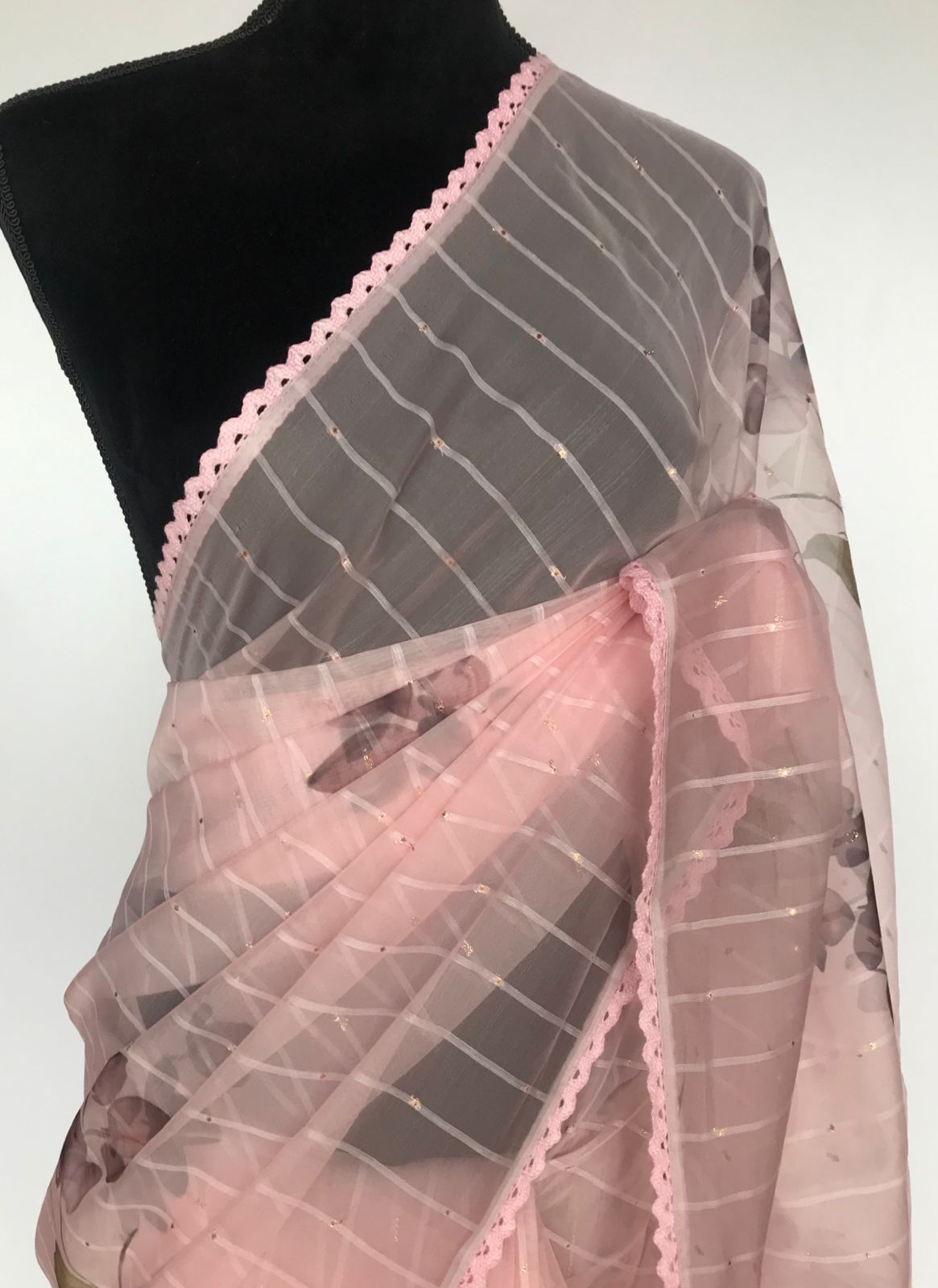• Peach Organza Saree with Floral Prints