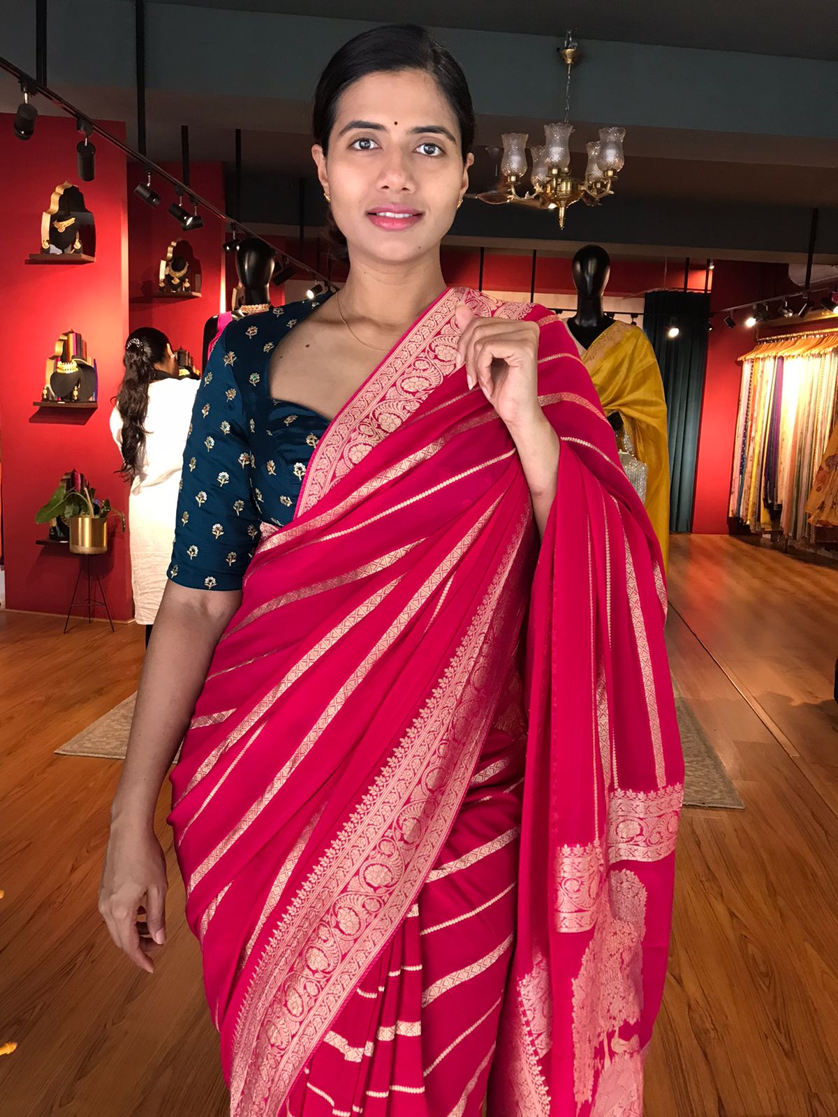 • Paired up with matching unstitched blouse in Banarasi Georgette