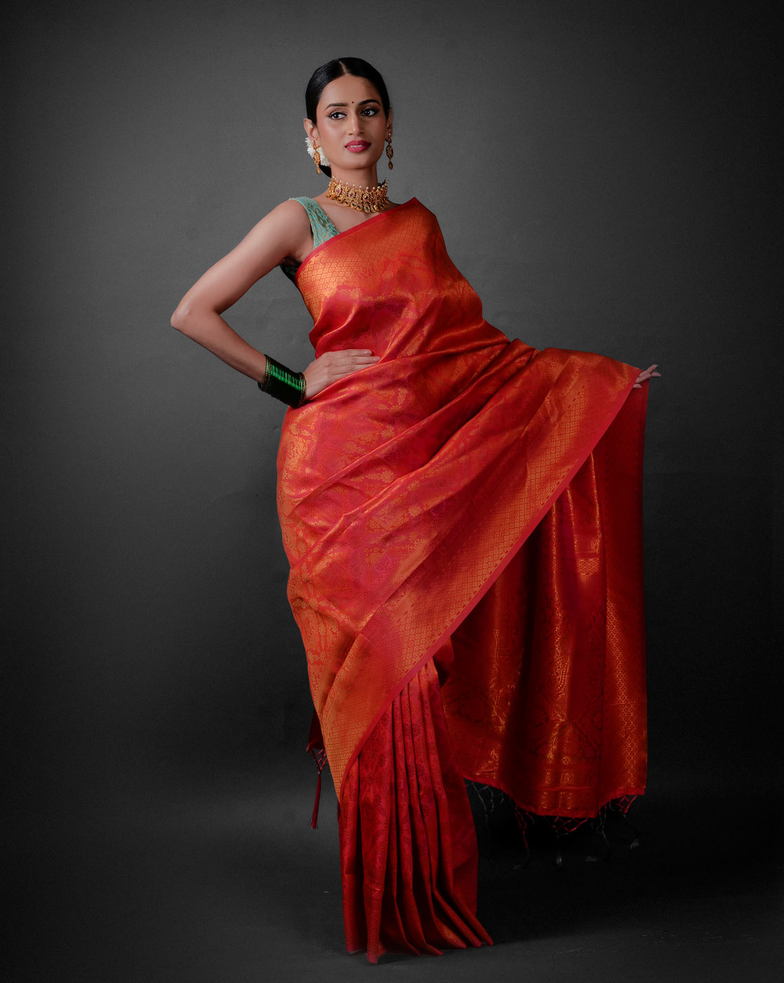 Be the first to review “Orange Banarasi Silk Saree with Zari Weaves”