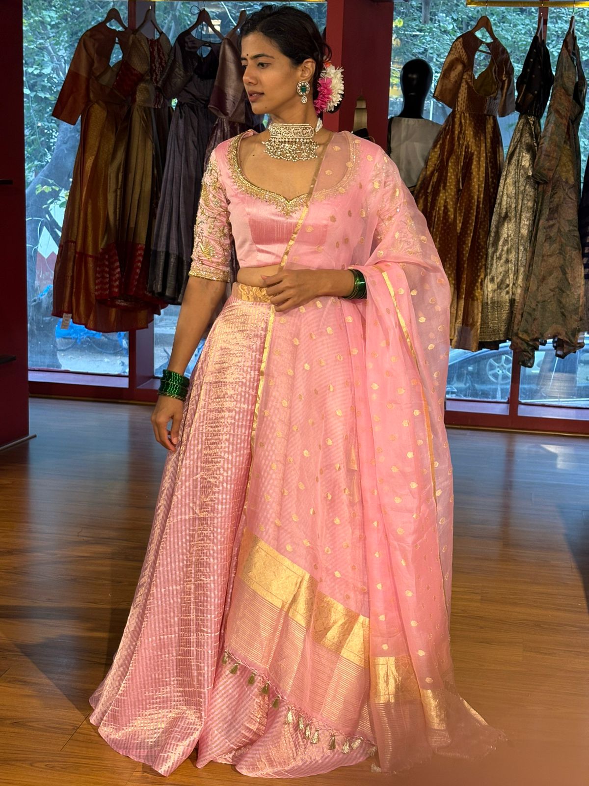 Pink Heavy Embroidered Silk Lehenga (Set of 3)