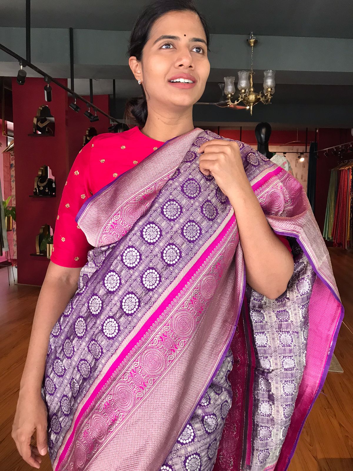 Purple Chiffon Saree with Pure Silver Zari Kadwa Motifs