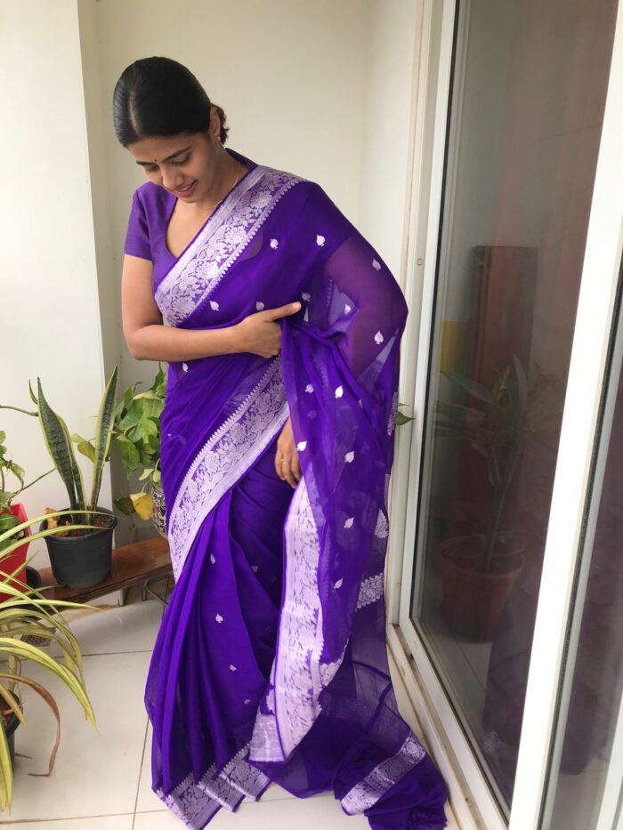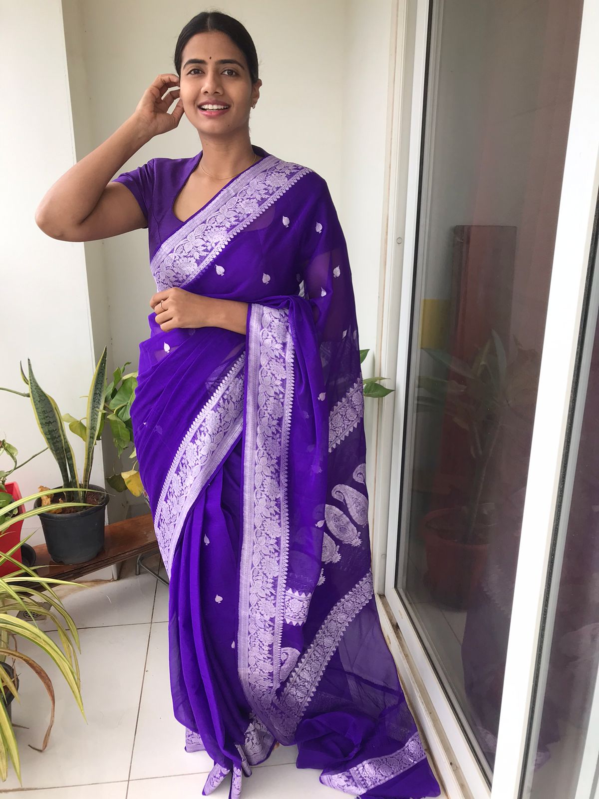 Purple Chiffon Saree with Pure Silver Zari Kadwa Motifs