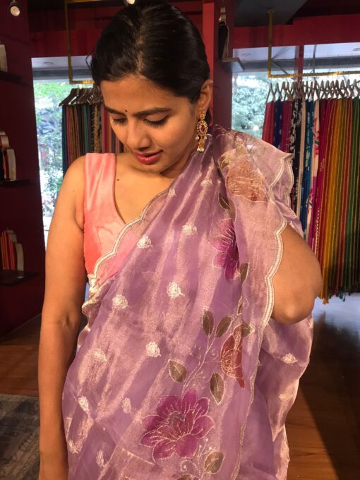 Be the first to review “Purple Hand Embroidered and Hand painted Tissue Silk Saree highlighted with Scalloped Border”