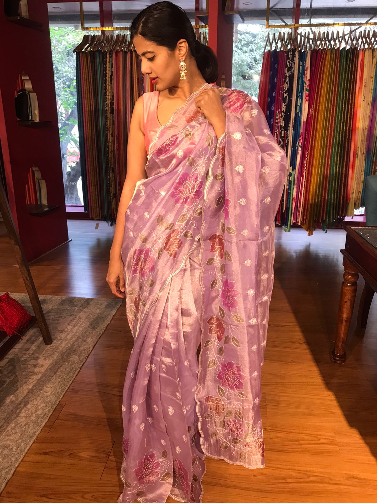 Purple Hand Embroidered and Hand painted Tissue Silk Saree highlighted with Scalloped Border