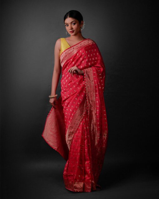 Radiate grace in our rani pink Banarasi georgette saree, adorned with opulent gold zari weaves. This lightweight fabric combines tradition with modern flair, making it ideal for weddings and celebrations. Elevate your ensemble with this exquisite saree that captures timeless beauty.