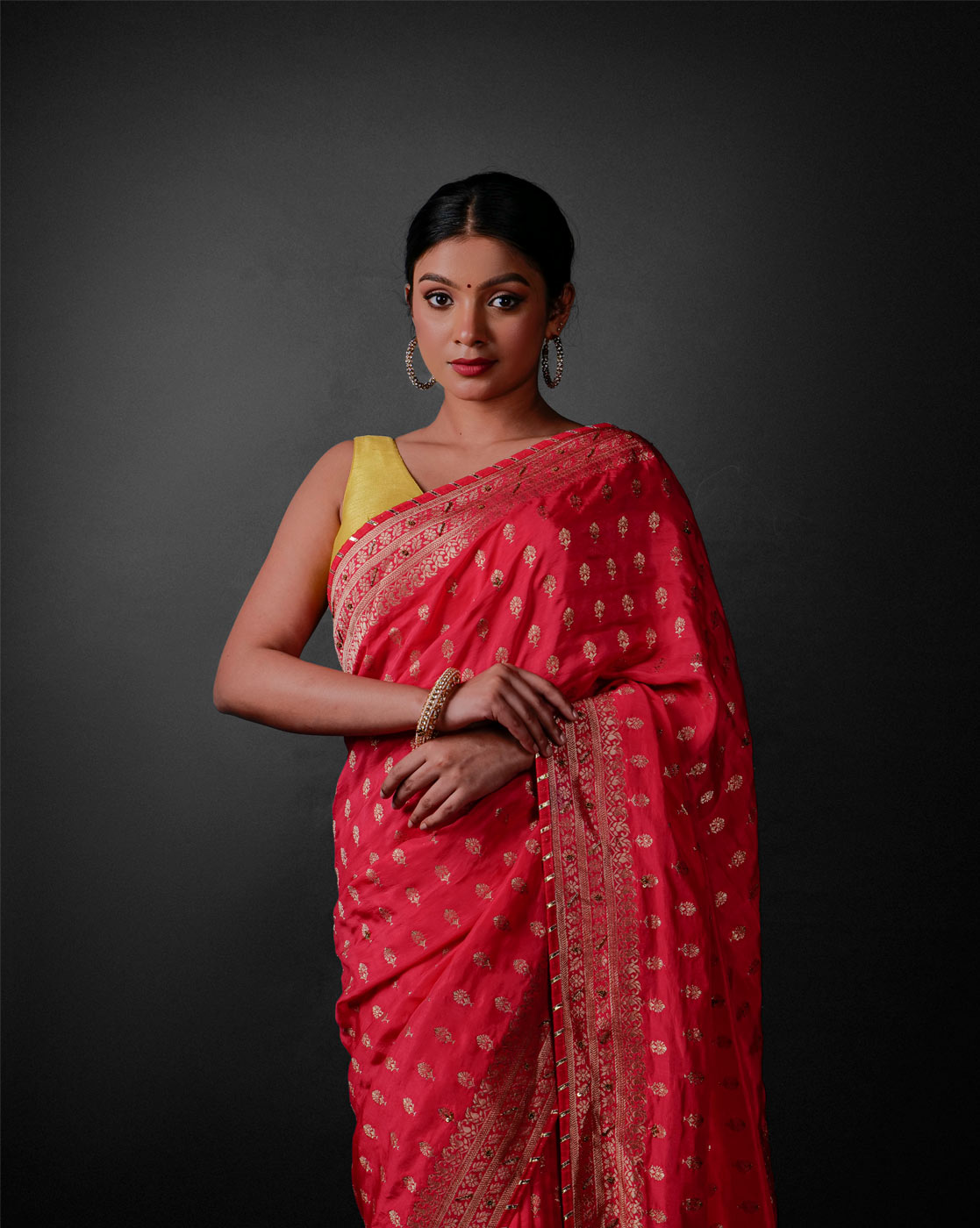 "Close up view of a model showcasing Blush Pink Brocade Tissue Silk Saree , Suited for stylish events. By Mirra Clothing