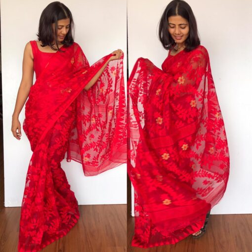 Elevate your style with this stunning red handwoven cotton silk Jamdani saree. The traditional Jamdani weaving technique and vibrant red color make it a perfect choice for weddings and celebrations. Its luxurious texture ensures comfort and sophistication.