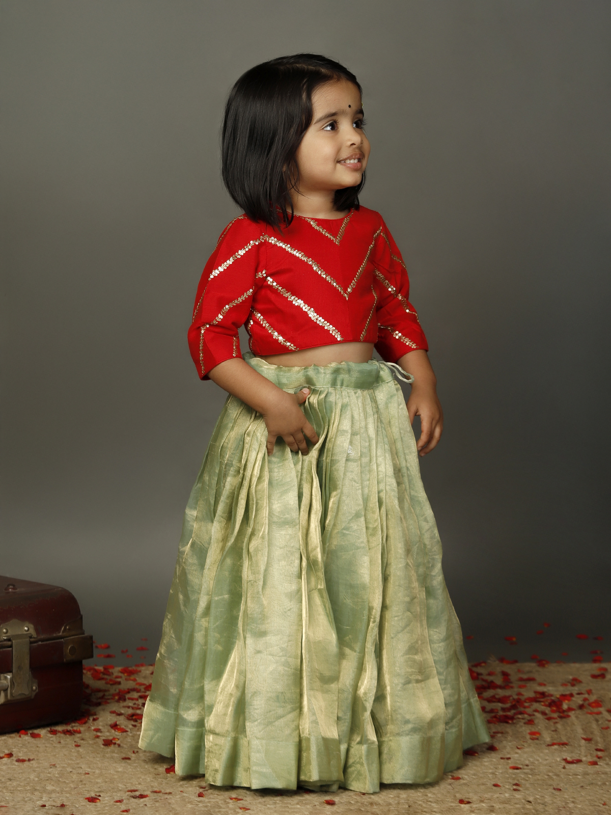 Elegant Red Sequence Top With Sea Green Silk Lehenga, perfect for festive or traditional occasions
