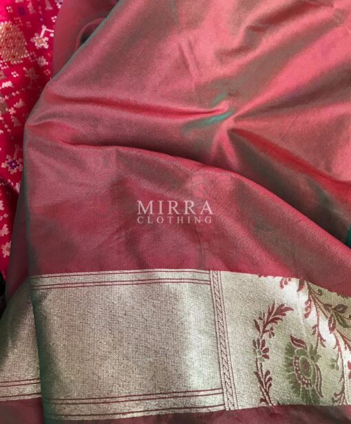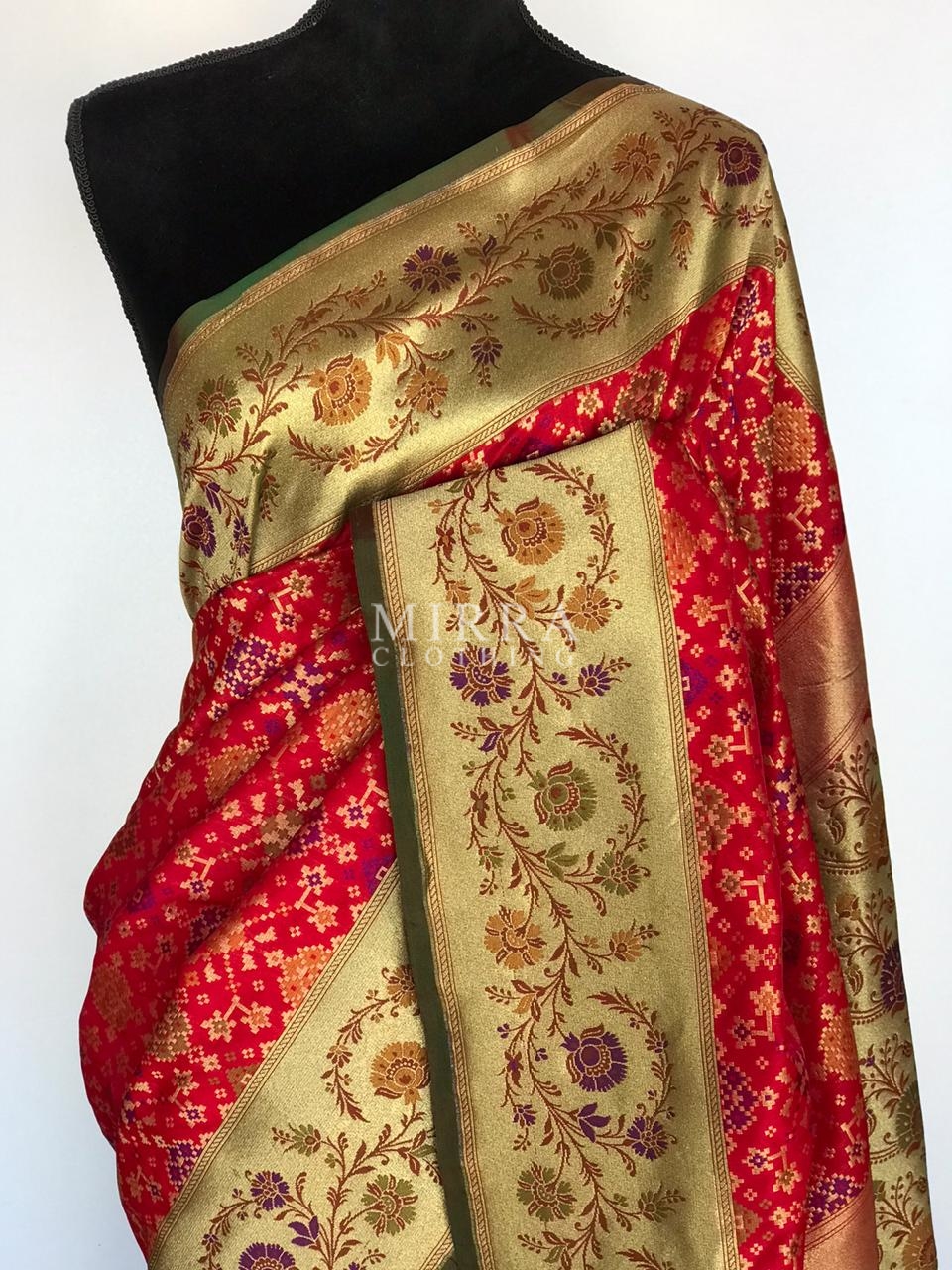 • Scarlet Red Banarasi Silk Saree adorned with Beautiful Patola Weaves