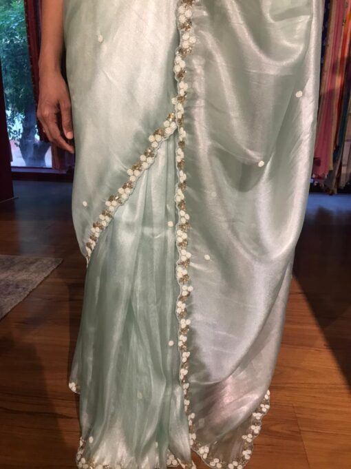 Sea Green Hand Embroidered Tissue Organza Silk Saree