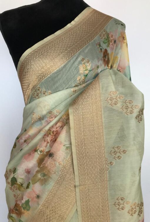 Sea Green Linen Silk Saree with Beautiful Prints along with Antique Zari Border