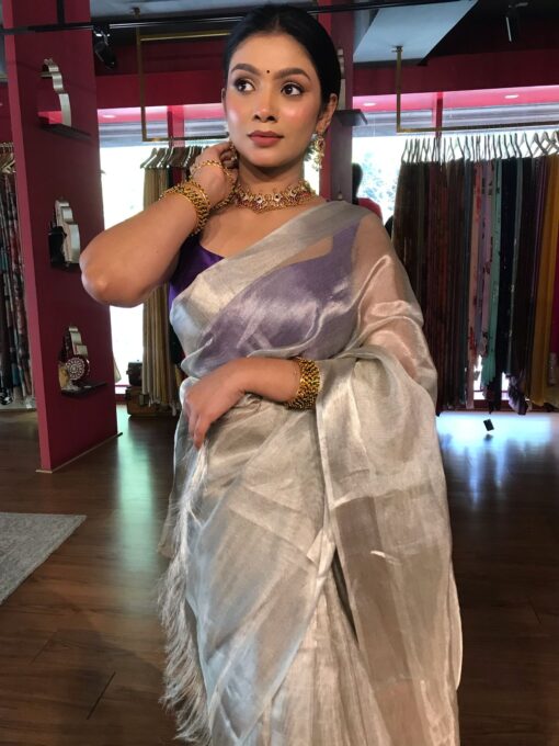 Be the first to review “Silver Tissue Silk Saree with Woven Silver Zari Border”