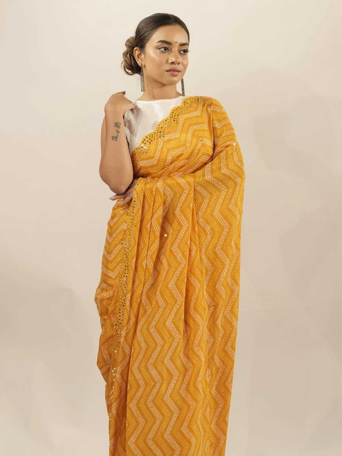 Sunset Yellow Crepe Silk Saree with Mirror Embroidery