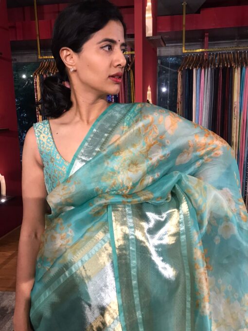 Teal Printed Organza Silk Saree with Kanchi Zari Border