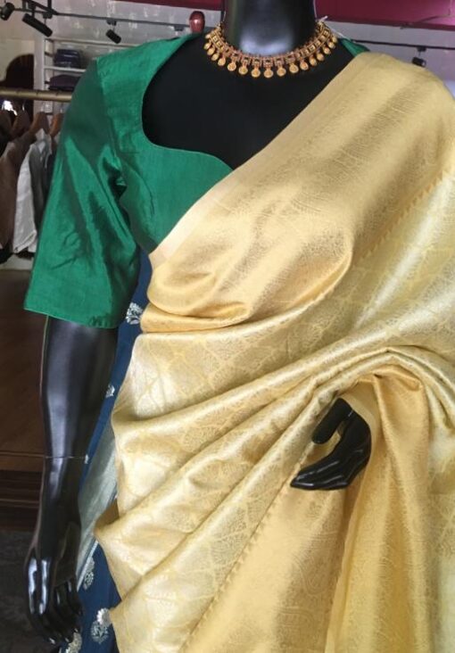 Be the first to review “Yellow Banarasi Silk Saree highlighted with Gold and Silver zari weaves”